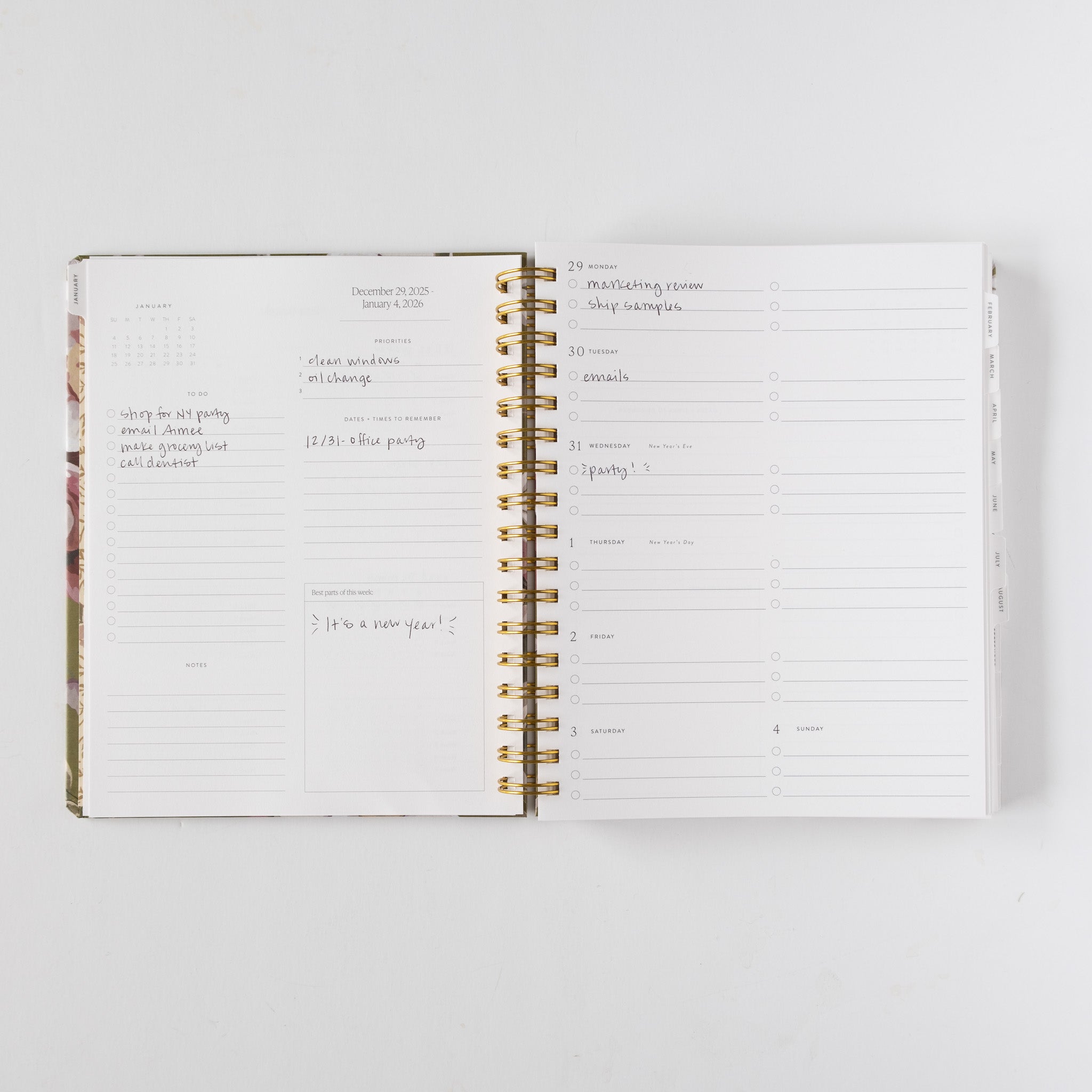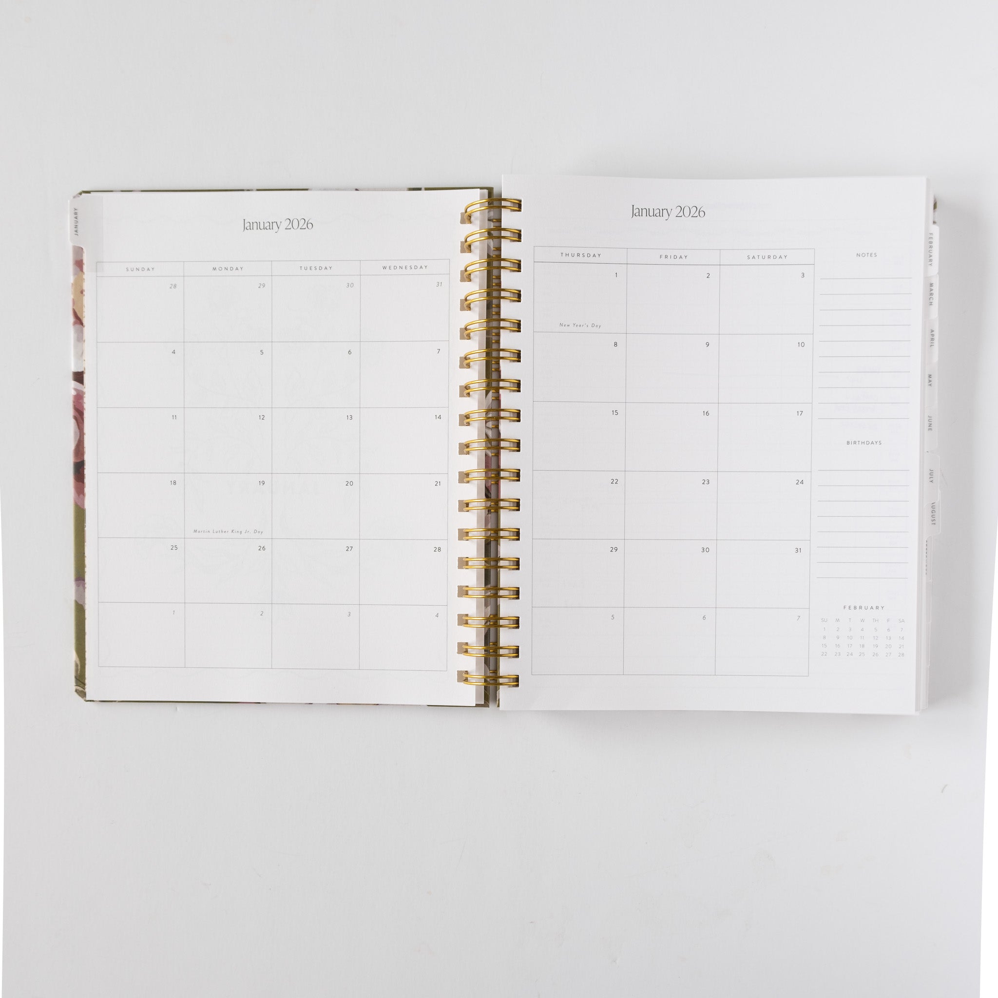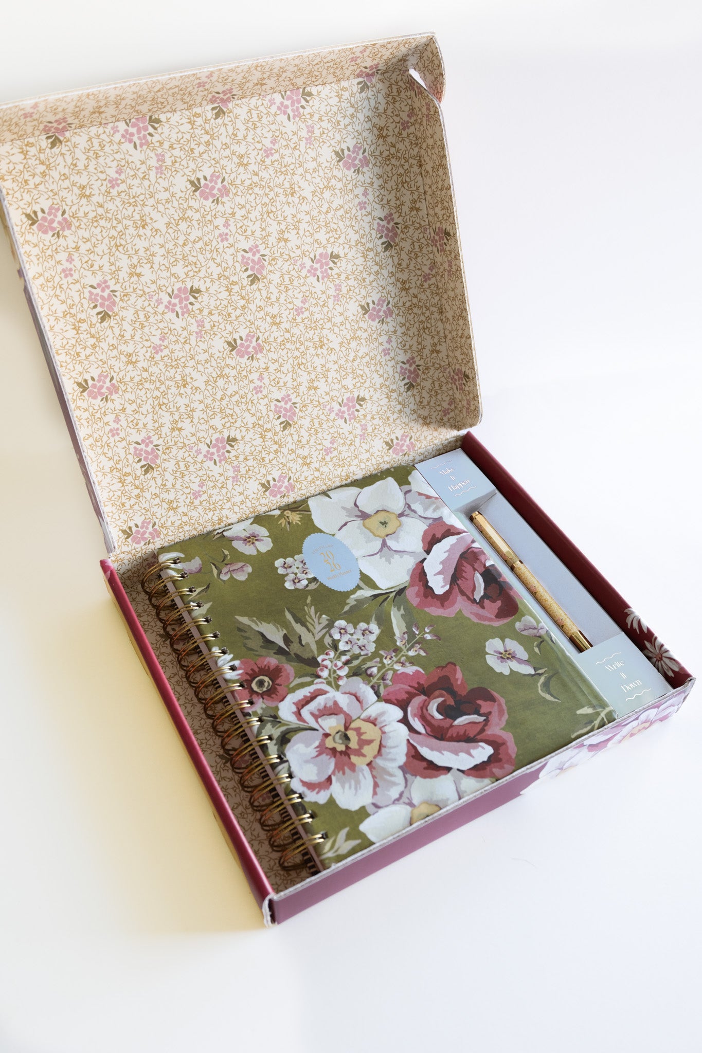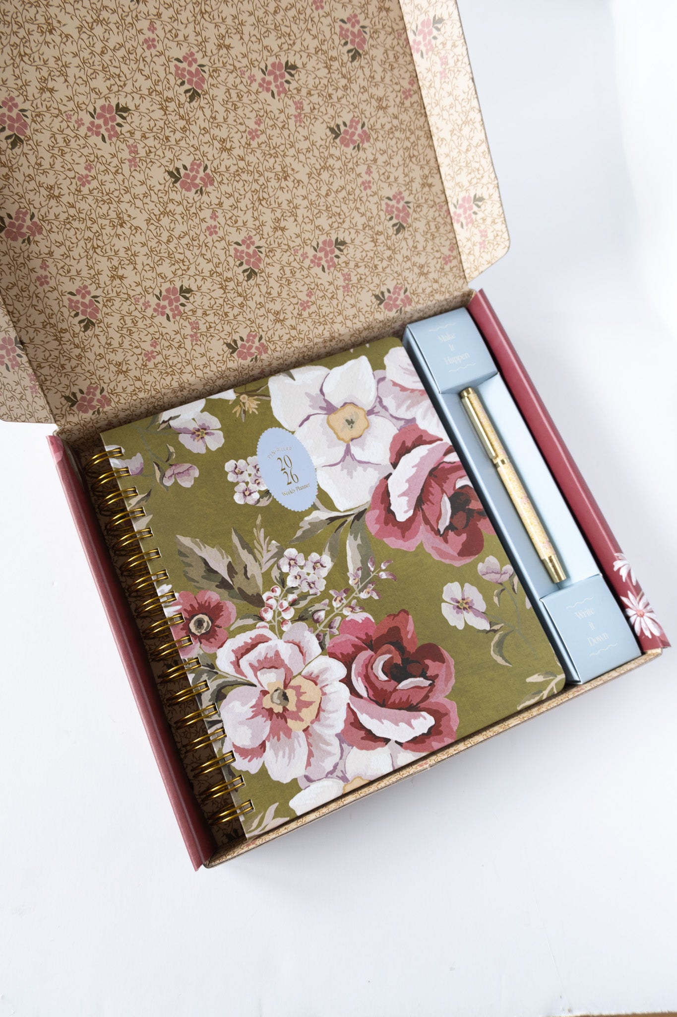 Tabs, monthly page art, notes pages, a matching pen, and an illustrated pocket folder make our planner beautiful and functional. It ships in a matching illustrated box, making it the perfect gift this season.