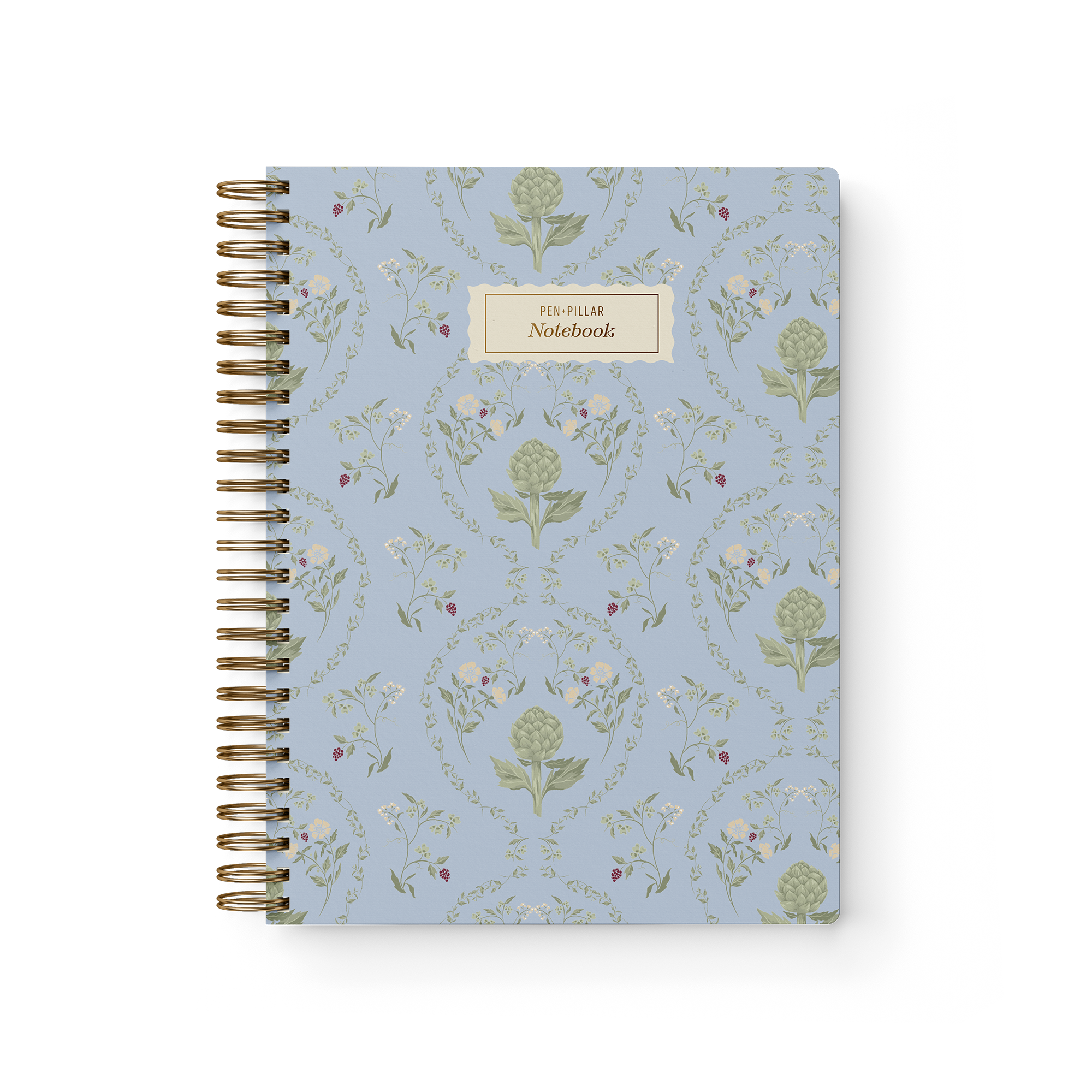 Premium Botanical Hardcover Notebook with gold foil accents. Hand-painted elegant artichoke botanical print in sage green, misty blue, and cream on a soft-touch matte cover — a beautiful stationery gift for journals, notes, and everyday writing.