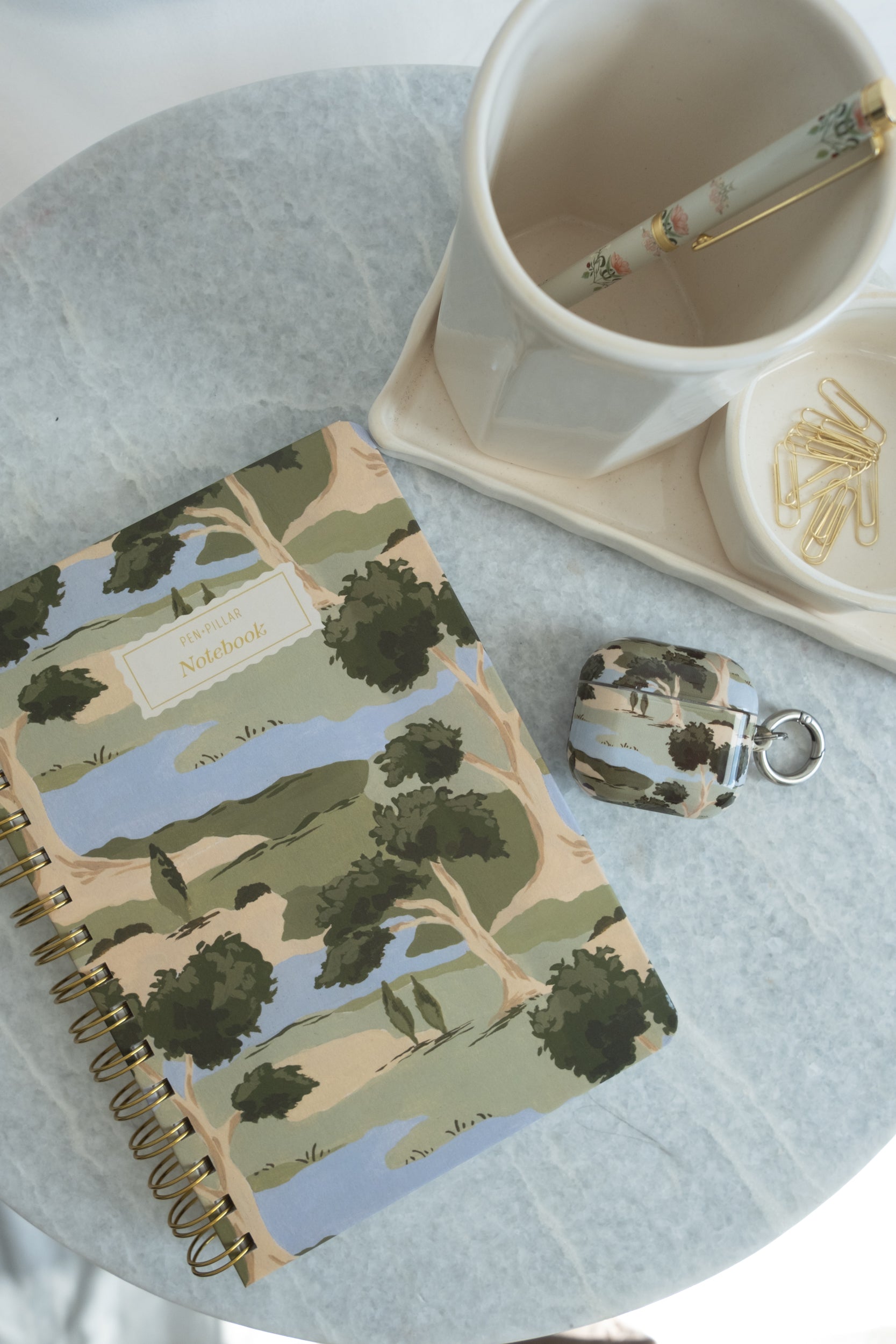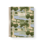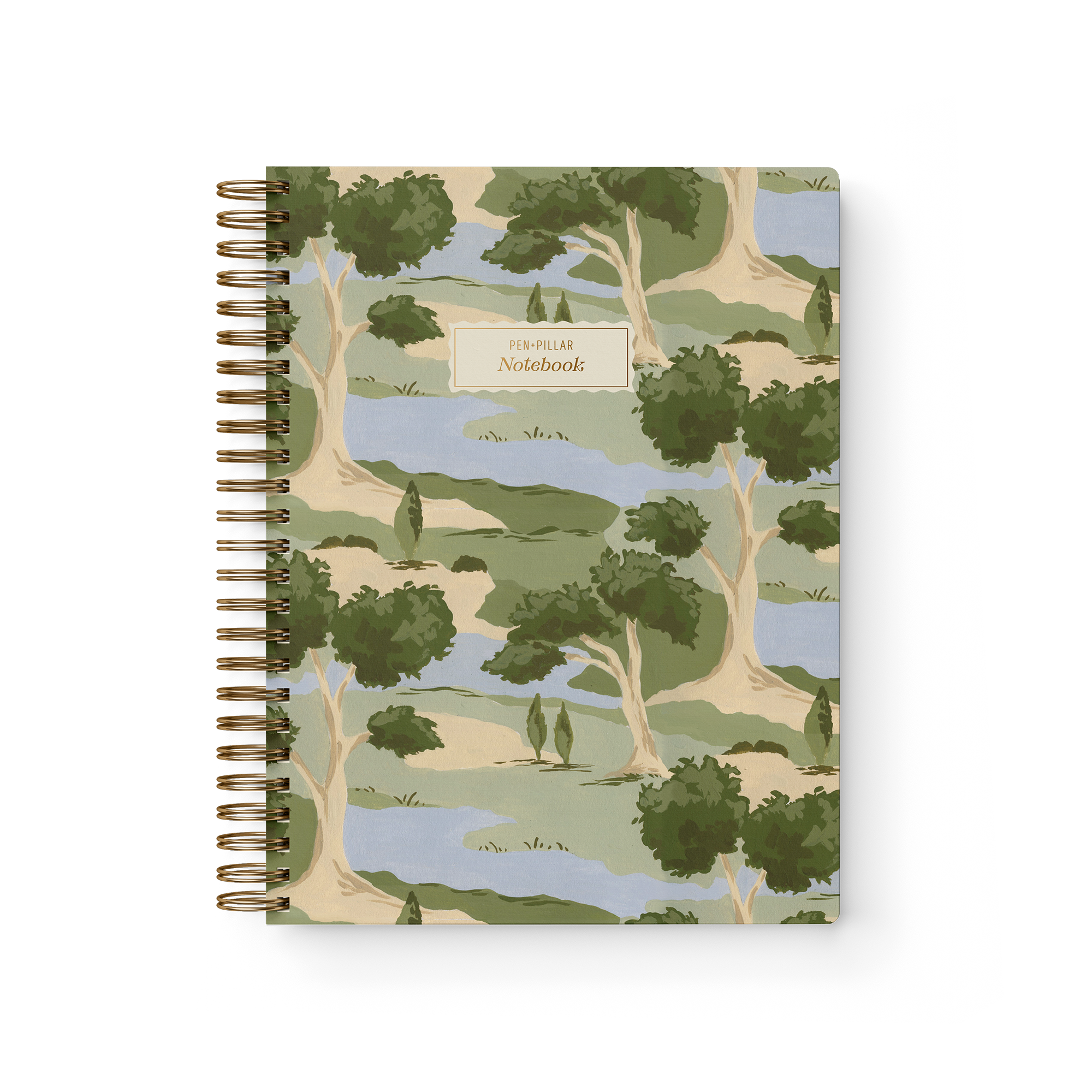Premium Botanical Hardcover Notebook with gold foil accents. Hand-painted scenic orchard landscape in muted greens, dusty blue and cream on a soft-touch matte cover — a beautiful stationery gift for journals, notes, and everyday writing.